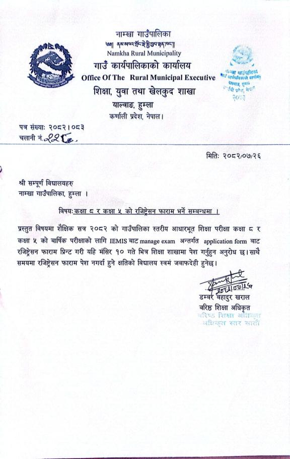 कक्षा ८ र ५ को रजिष्ट्रेसन फारम भर्ने सम्बन्धि सूचना।