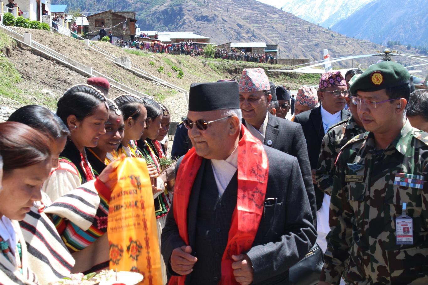 २०७५ वैशाख १ गते हिल्सा नाकाकाे अवलाेकन पछि सम्माननिय प्रधानमन्त्रि केपि शर्मा अाेलि ज्युलार्इ जिल्ला स्थित एयरपाेर्टमा स्वागत गर्दै स्थानिय वासिहरू